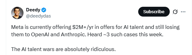 I saw this morning that the tech giants are still hurling ungodly sums of cash at 20-somethings in the highest echelons of computer science. This is obviously not sustainable, but I suppose the logic is that at some point there will be only one true winner, and companies are willing to spend any amount to be that “one“.