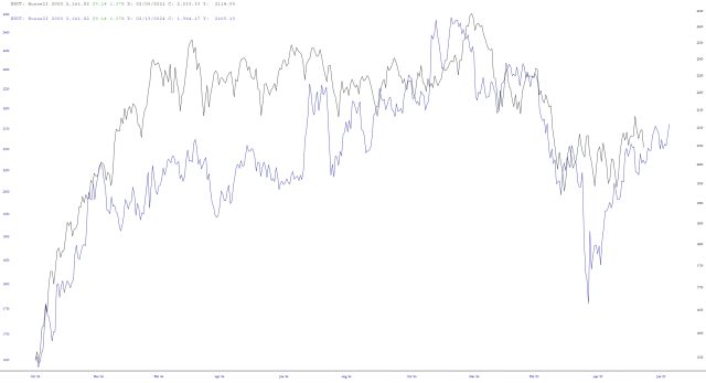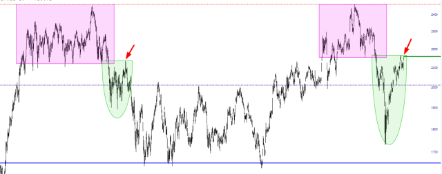 The meandering Russell 2000 is continuing to drive me bonkers, but I wanted to offer myself, and you, a bit of longer-term perspective. Here is the kind of activity I’ve been tracking on the /RTY, with the salient portions highlighted.