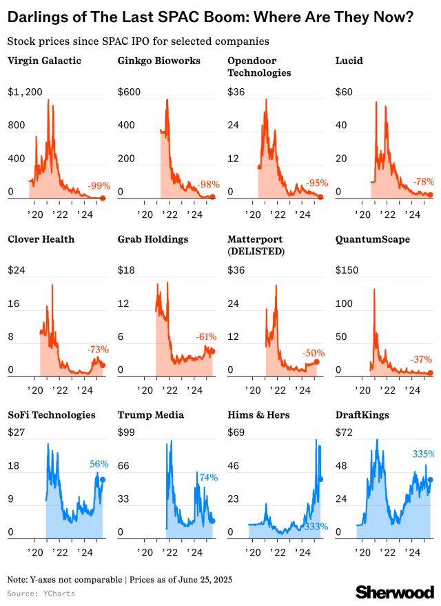 Here are some of the best-known SPACs; on average, it hasn’t been a great run.