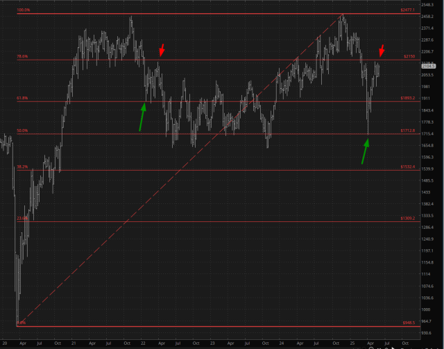 Amidst all this murk and muck, just about the only pattern presenting itself with reasonable clarity remains the long-term /RTY futures, whose Fibonaccis are doing a yeoman’s job of providing support and resistance. I have offered the arrows below to suggest an analogy between what happened in late 2021/early 2022 and what’s going on right now.