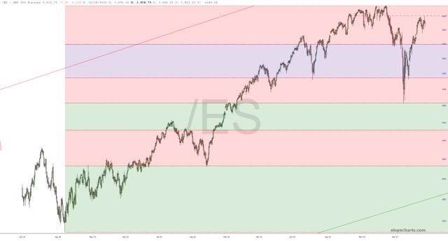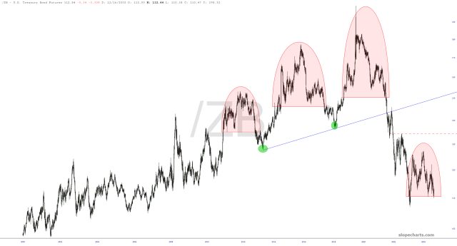 Finally, bonds are monstrously important. If we crack below the pink pattern I’ve highlighted, you will see interest rates soaring and, at long last, equities melting.