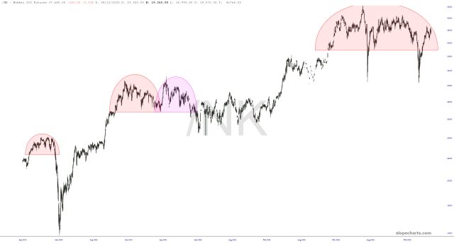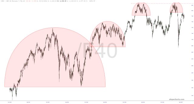 Overseas, the CAC-40 from France is vastly cleaner, with a well-defined top that promises to smack down prices with the same gusto as President Macro’s permanently angry wife.