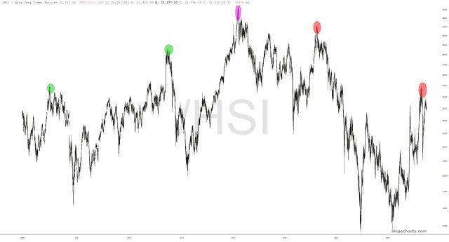 The Hang Seng Index, shown here over a period of decades, had its day in the sun (green circles), reaching its lifetime peak many years ago (purple) and, since then, lurcher lower as China’s debt-laden economy starts to push reality into the forefront (red circles). I think the Chinese economy is going to suffer right along with the rest of the world, although once we all reach the other side of it, China could well find itself on top of the global economic heap.