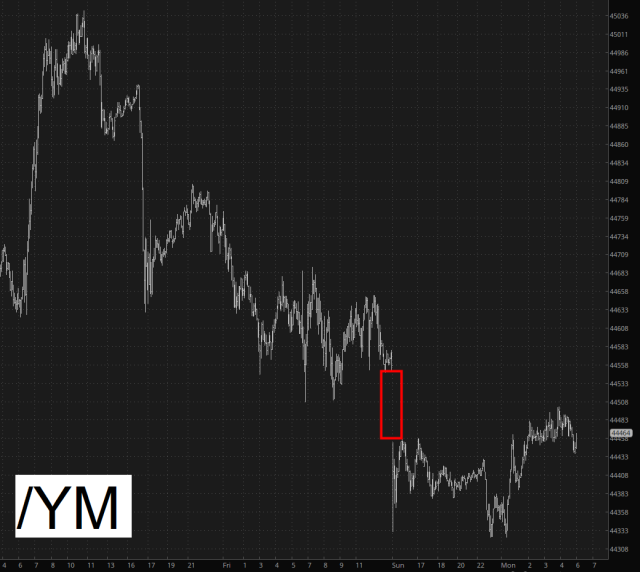 It seems the market is now totally immune to trade war news. It just doesn’t care. The bombshell on Saturday that both the EU and Mexico would be slapped with 30% tariffs would have, in normal times, caused an historic crash? Today? Well, pre-market, equities (shown below with the /ES) are down maybe one-fifth of a single percentage point. Just. Don’t. Care.