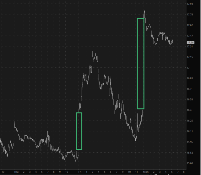 Oddly, fear seems to be coming back in, at least by way of the /VX futures. Since the quite sad 15-handle on the VIX last Thursday, we’ve at least got a pulse again with volatility.