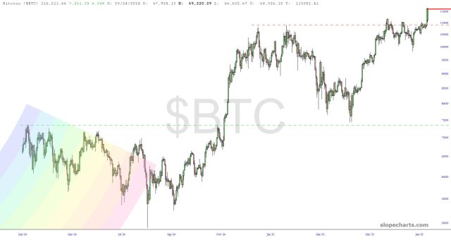 Looking at the daily chart of Bitcoin (as opposed to the minute bars above), $BTC may well add tens of thousands more from here, if its breakout is anything like the last one it executed. I stopped trading crypto back in 2021, but as a chartist, I’ve always been fond of the stuff, and I wouldn’t be surprised to see all this pent-up energy get expressed in $BTC going to – – I dunno – – $140,000 or so? It’s anyone’s guess.