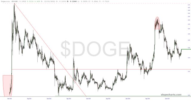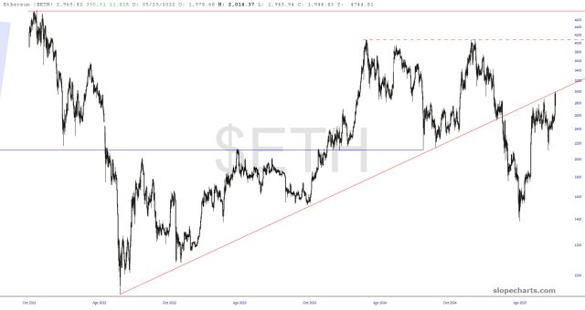 Allow me to put one fly in the ointment, however. Ethereum is enjoying a particularly strong lift right now, but I would at least like to point out the formidable broken trendline it’s mashing up against. It’ll need to clearly cross this line and make it relevant, because failing to do so and sinking away from this line will not be helpful to its other crypto compatriots.
