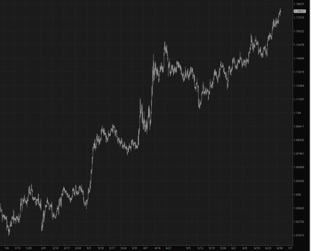Lastly, if you want a sense as to the United States’ worldwide reputation and regard, look no farther than the performance of our currency, which has suffered its worse half-year performance (double digit negative percentage change) since 1973. Europe, on the other hand, as seen by way of the EUR/USD, is just setting the world on fire.