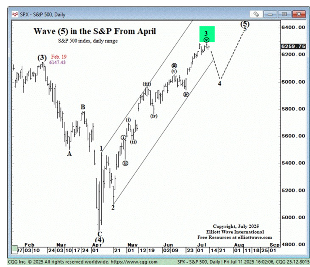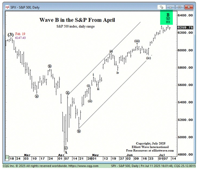 The S&P 500, however, is shown as wave 3 of (5) meaning that, yes, it’ll fall right about now, but new lifetime highs are on the way. And, just to illustrate anything can happen, the exact same index is shown in the midst of an A-B-C wave.
