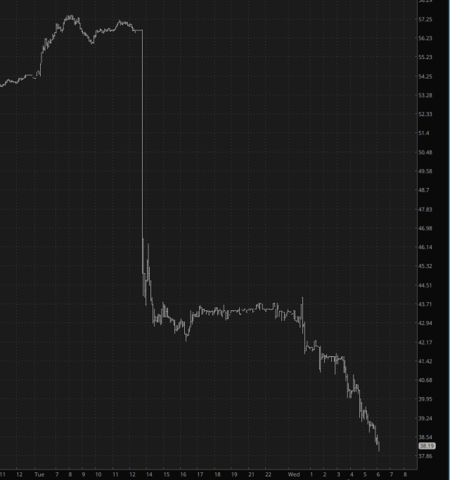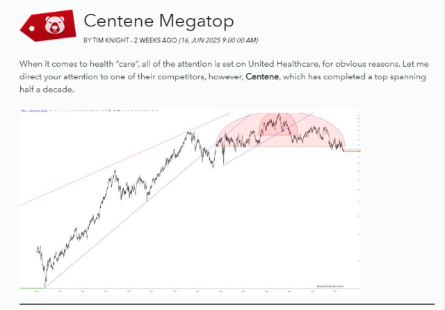 I didn’t know about this company until I explored the so-called healthcare provider sector following the UNH event, and although Centene’s vastly overpaid CEO is easier on the eyes than her competition, I still felt the chart was hideous. Here what it’s doing right now – – a total wipeout: