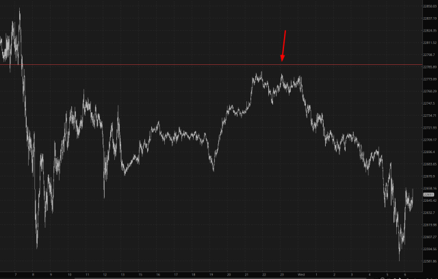 The /NQ, having slipped before its former lifetime high yesterday (red line) rallied all night long and yet respected that same line in its new role of resistance (red arrow).