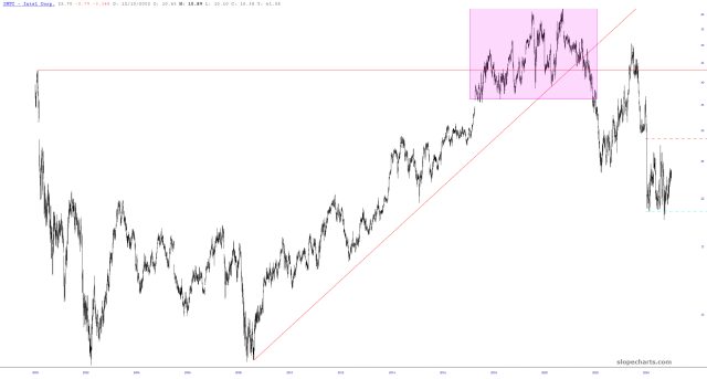 Since 2000, however, they’ve been a total train wreck. To be a high-tech stock UNCHANGED in price since early 1999 is pretty damned impossible, but Intel managed to pull it off.