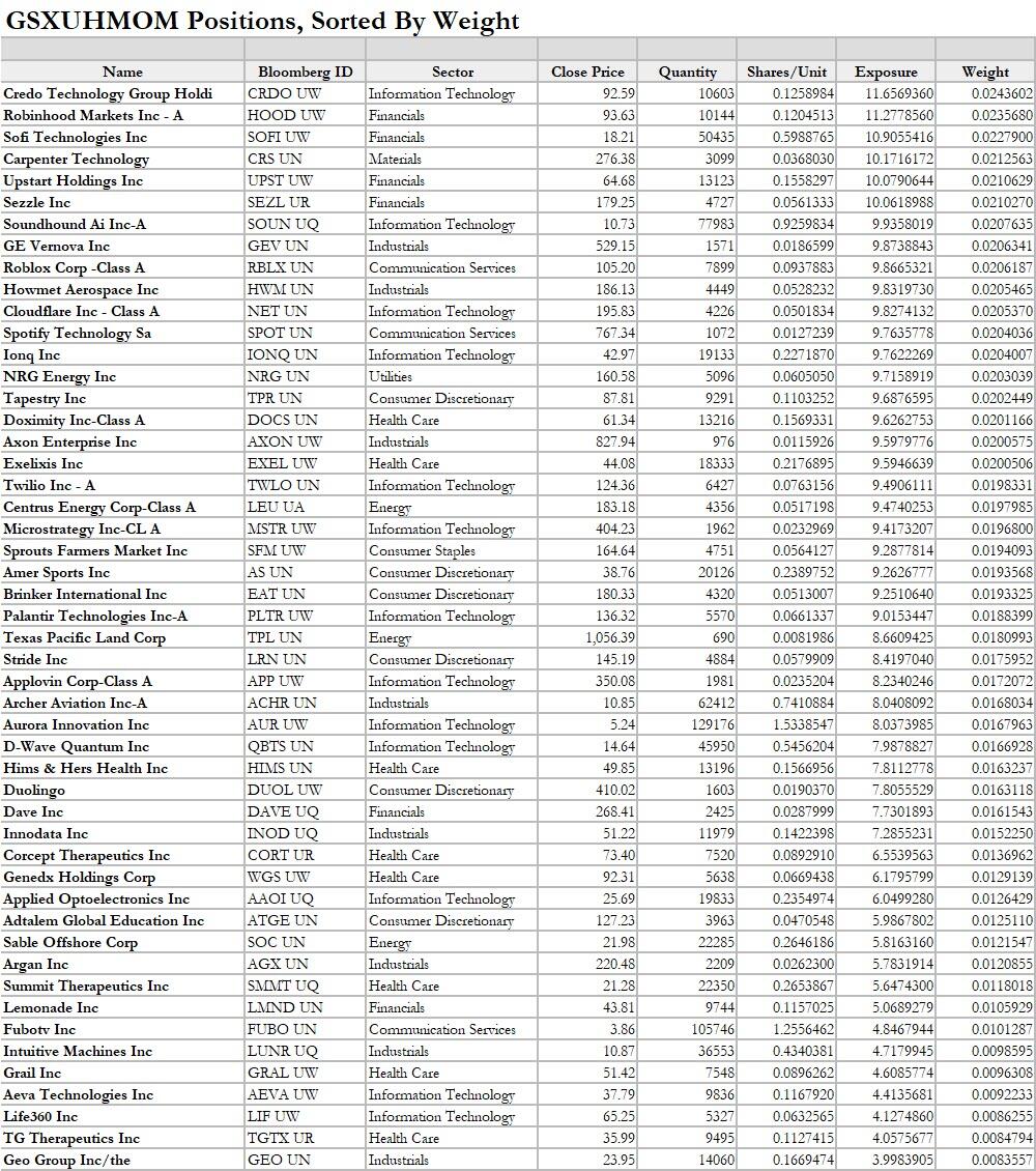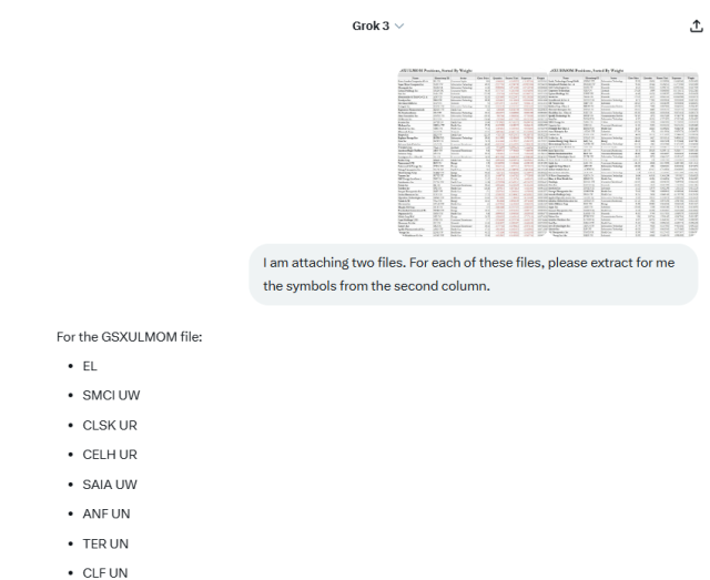 Over at the permabull site Zerohedge, I was glancing at an article which broke down the Goldman Sachs (of course……..) basket of high momentum, high beta stocks. They presented the list in two dense graphics, here and here, and I decided to use my old friend Grok to tease out the actual symbols.