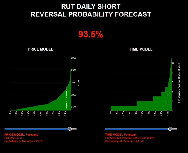 This is a strong reversal signal. As always, it’s important to emphasize that this isn’t a crystal ball—rather, it’s a statistical reflection of similar historical patterns. If you examine the price and time models, you’ll notice that in rare cases, rallies have continued beyond this point. Could it happen again? Yes. But historically, the higher the trend stretches, the more difficult a trend continuation becomes (momentum effects do exist, of course—but not every trend continues climbing for 10 consecutive bars. All trends eventually exhaust themselves).