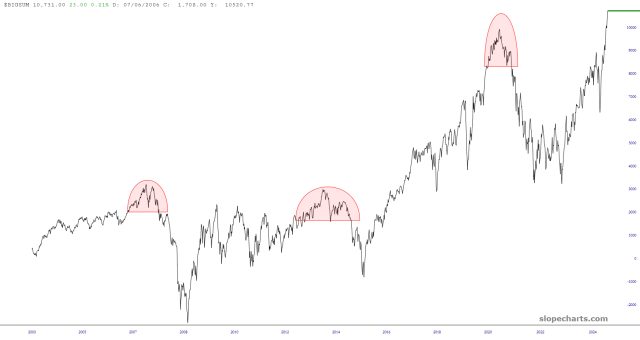 A vivid illustration of the resolute (and, for a few loonies like me, painful) market strength is the $BIGSUM, which is the cumulative advance/decline indicator for the largest stocks. In time gone past, this thing would top out and fall with some regularity. This time, it’s been an uninterrupted moonshot.
