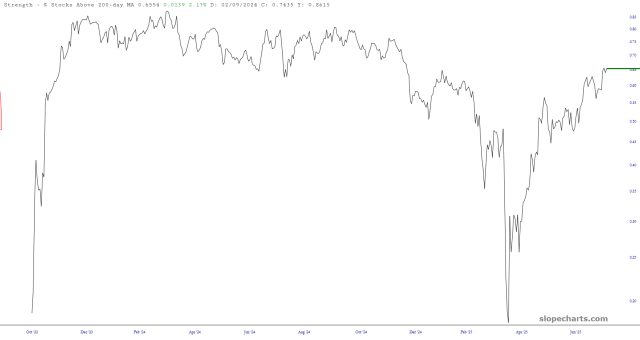 Another way to look at this is via the percentage of stocks above their respective 200-day moving averages. This plunged during the all-too-brief Liberation Day debacle, and it has since surged back to health in the 70s.
