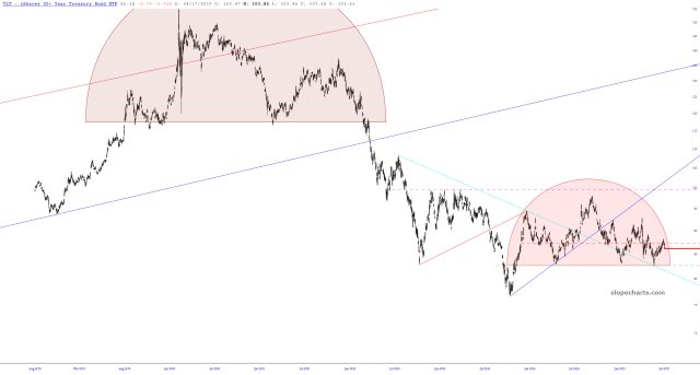 Bonds have been in a bear market for half a decade, and my view is that, should the aforementioned support level break, we’ll have completed yet another important continuation pattern and should keep pushing lower (and, thus, rates will keep pushing higher, no matter how much Trump jumps or and down about Powell and no matter what bootlicking sycophant he ultimately installs to replace him as the Fed chief).