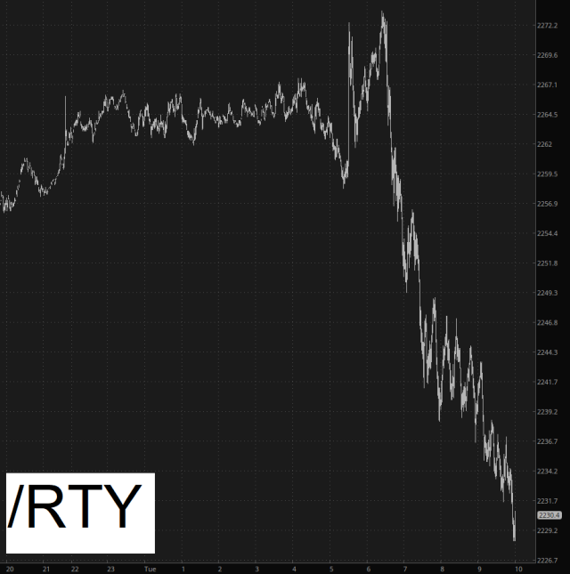 The small caps, while up earlier, have likewise cratered, falling 1.34% as of this writing which, again, probably demands a multi-trillion dollar federal bailout to save the bulls.