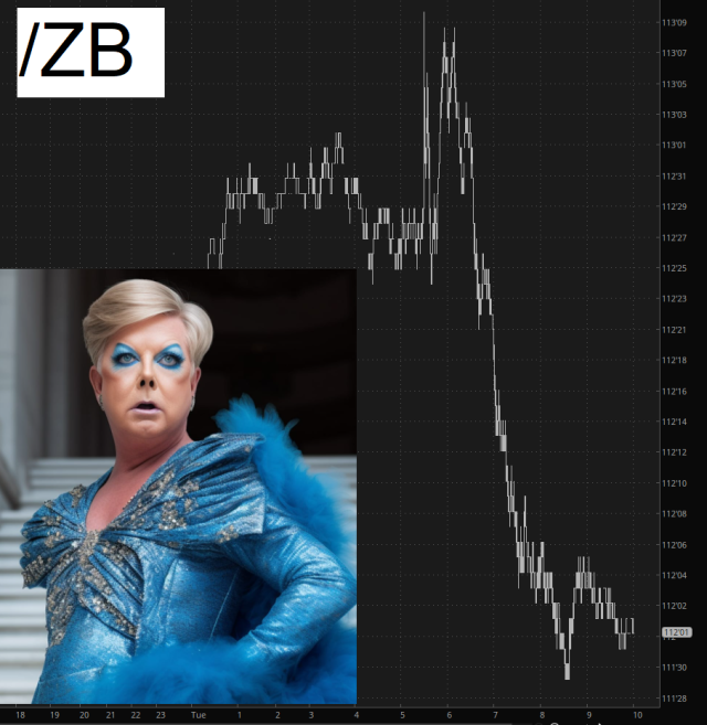 And, most interesting of all, the bonds – – my biggest short – – zipped higher today, only to barf all over themselves.