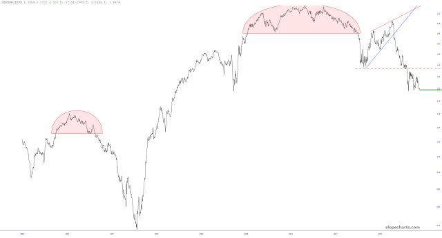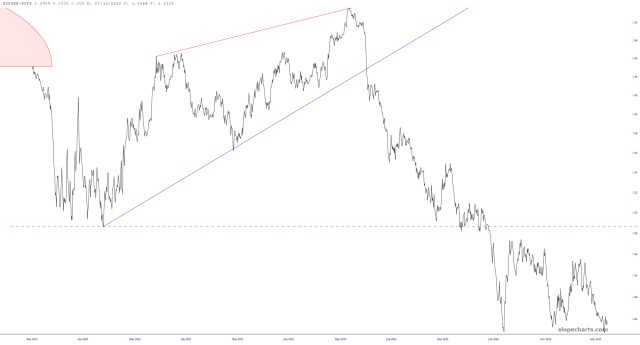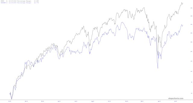 A different way to see this instead of the percentage graphs above is to use a ratio chart. Below is the chart of $SPXEW/$SPX (that is, the equal-weighted S&P divided by the standard S&P). A strengthening chart means the equal-weighted is beating the standard, whereas a descending chart means just the opposite. As you can see, this chart has been breaking down just like any normal financial instrument would (even though it’s a concocted indicator and now something really tradeable). What it’s telling you, just the same as the earlier charts, is that the daily lifetime highs we’re seeing can be credited largely to the mega-caps, which are doing all the heavy lifting.