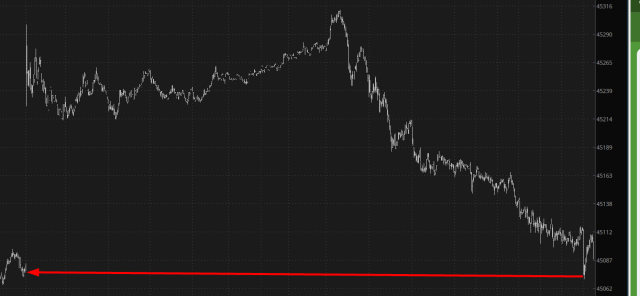 It’s true that yet-another-surrender to China (the latest 90 day “pause” which will be followed by endless others) and a very modest tariff with the EU spiked prices all over the world. I would mention, however, as the /YM chart illustrates below, the ecstatic gap higher (left side) eventually burned up in the atmosphere. It’s actually pretty damned jaw-dropping that this enormous gift to the bulls is, at the moment, an empty paper box.
