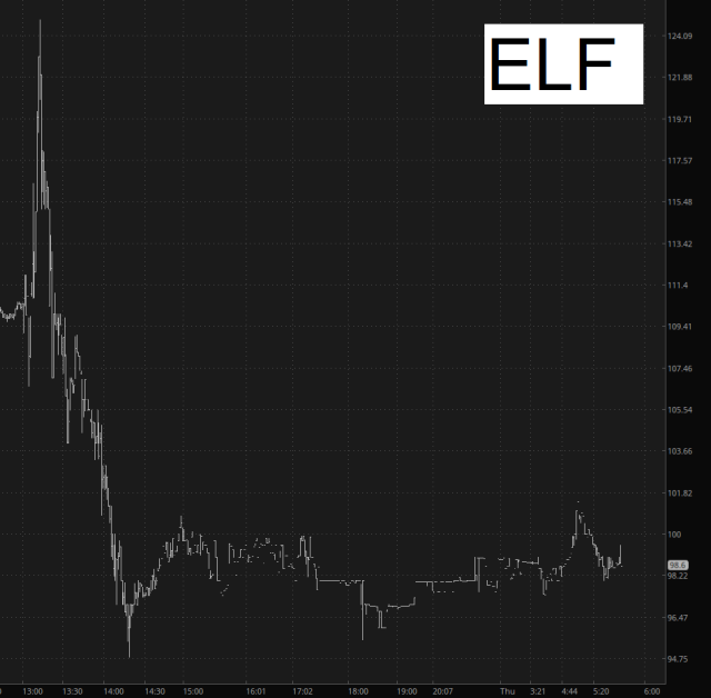 As the /NQ chart illustrated, the market has been pushing higher all night long, and the morning screen is annoyingly green. A couple of my positions are looking good for the open. Those are e.l.f. beauty: