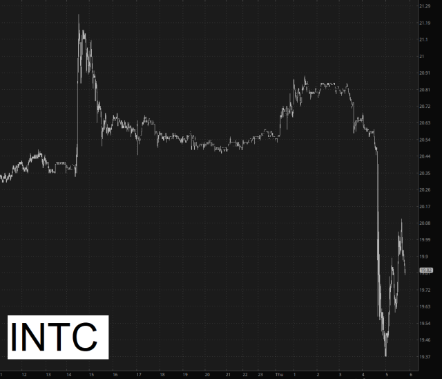 Funny enough, the one company that responded positively to the brief 100% tariff news was Intel since, as a company right here in ‘Mericuh, they would benefit from this arrangement. When it became clear that no such advantage was forthcoming, poor old Intel, whose heyday ended a full quarter century ago, simply returned to doing what it does best………..which is bleed out to lower price levels.