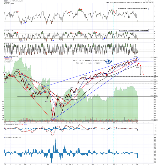 On QQQ the move down on Friday also reached the first possible neckline that I had marked on the chart. Possible hourly RSI 14 and RSI 5 buy signals are brewing but not yet fixed.