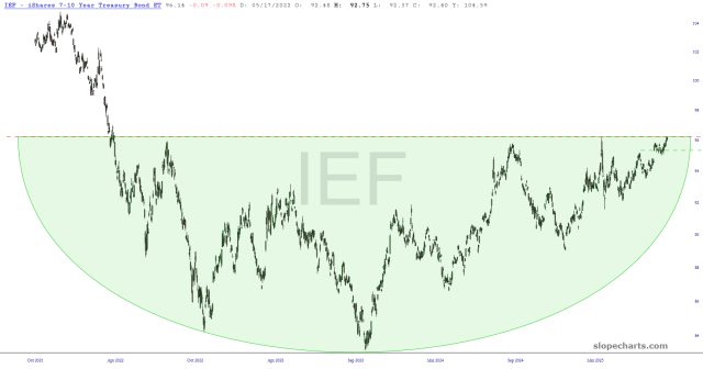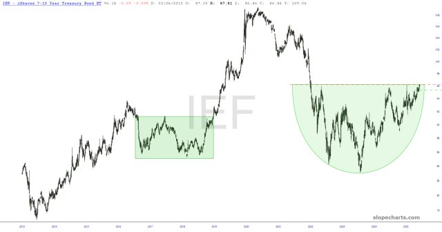 Medium-term bond fund IEF looks at the cusp of a breakout. My hunch is that the jobs report Friday morning will cause rates to crater, since it’ll be clear the economy is puking all over itself and Powell will have to deep-throat Trump’s desire to slash rates.
