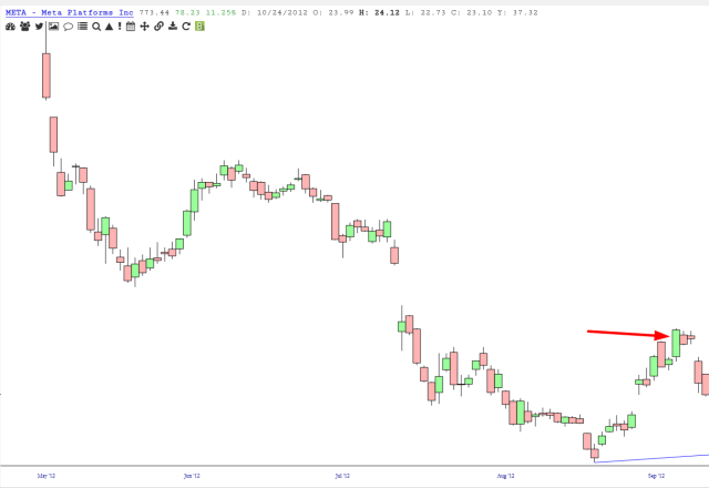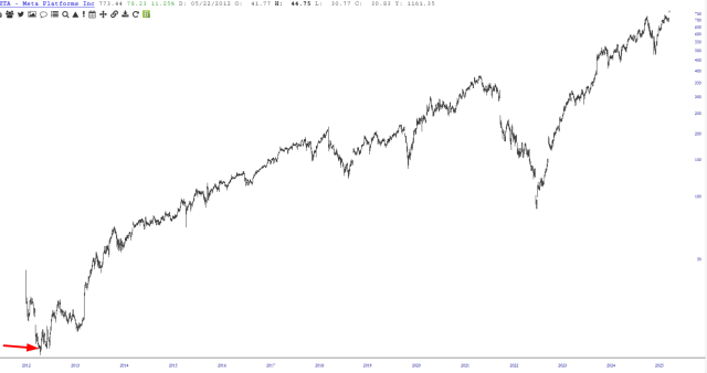 The red arrow marks the date of this article. As you can see, following its IPO, Facebook (now called Meta) had a pretty lousy time of it.