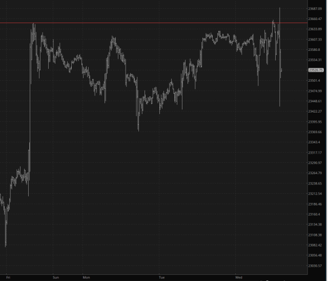 The NASDAQ was expecting a boost, and it even briefly pushed above last Friday’s peak (red horizontal line), but it’s plainly given up that level.