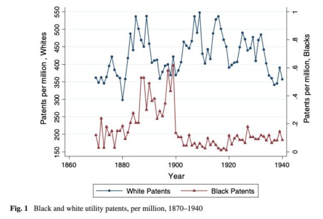 Here is the figure from her study, showing a collapse in the number of Black patents recorded exactly at 1900, when the world’s fair exhibition took place.