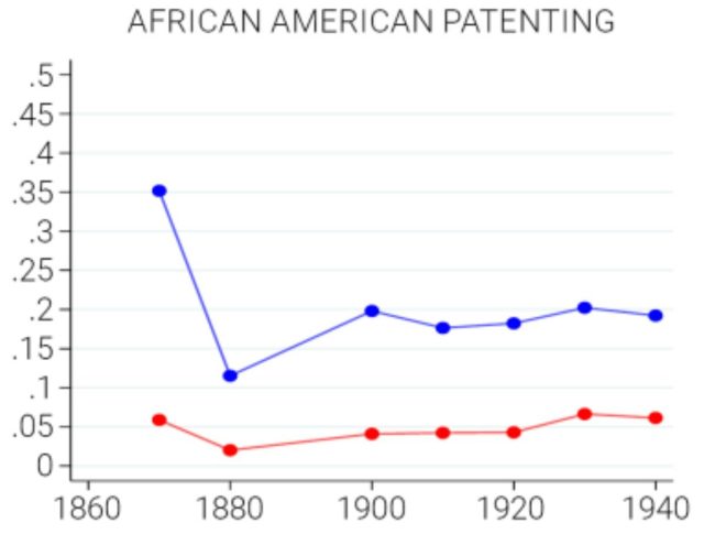 And here is data from the Brookings Institute, identifying 50,000 patents, showing that there was in fact no real decline in Black patents in the year 1900 (red line).