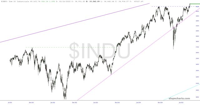 In the midst of lifetime highs, let’s take a stroll through some major cash index markets. The NASDAQ Composite is near lifetime highs but didn’t quite make it there. On Friday, tech stocks were strong but less than half as strong as the small caps. The damage to the trendline is formidable, and if there’s going to be any weakness next week, it’s much more likely from tech stocks than, let’s say, the industrials.