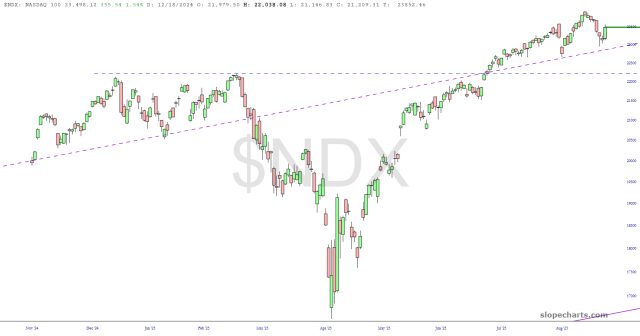 The narrower NASDAQ 100 has similar markings to the $COMPQ: a failure to achieve a new high and a horribly damaged uptrend. The blast-off on Friday merely put prices back to where they had been a couple of days prior.