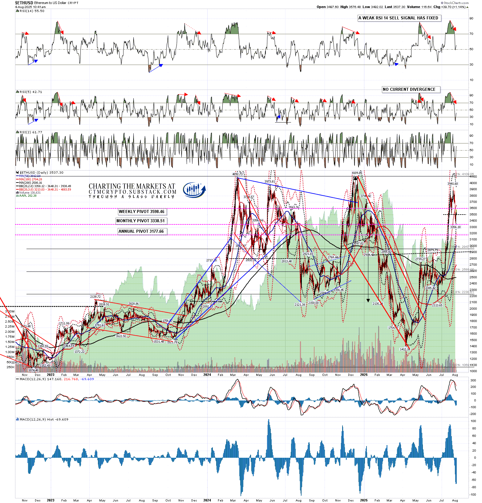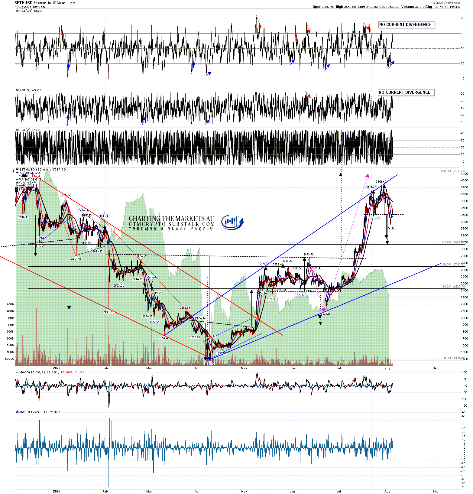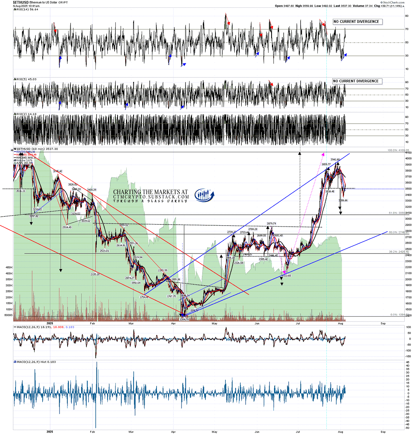 Looking at Bitcoin first the rising wedge I was looking at in my last post has come close to a test of the rising wedge support trendline, currently at 112k. The pattern from the high may well be a bull flag forming but I’m thinking that wedge support may well break and, if so, I’d be watching the 38.2% and 50% retracement levels in the 104.5k and 98.8k areas respectively.