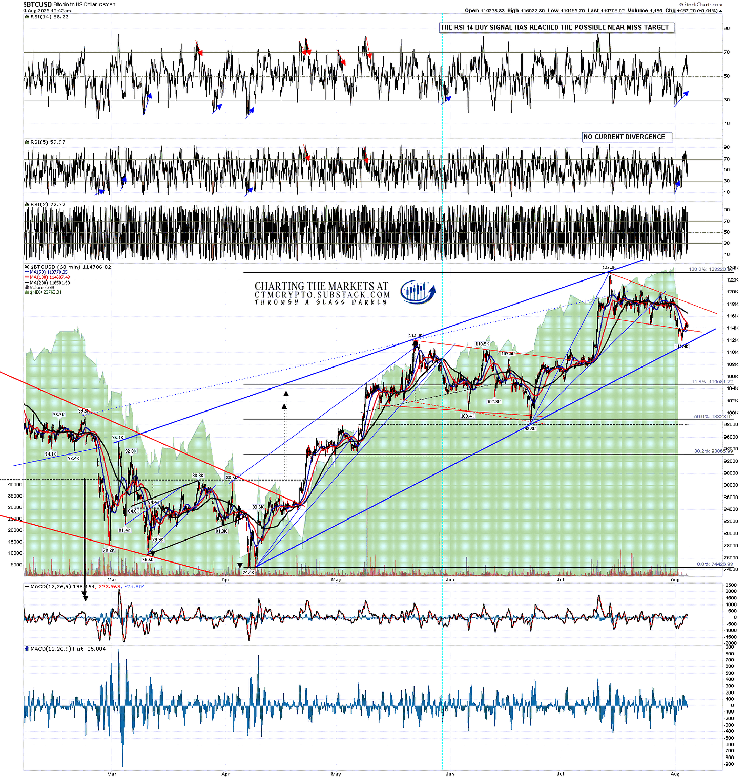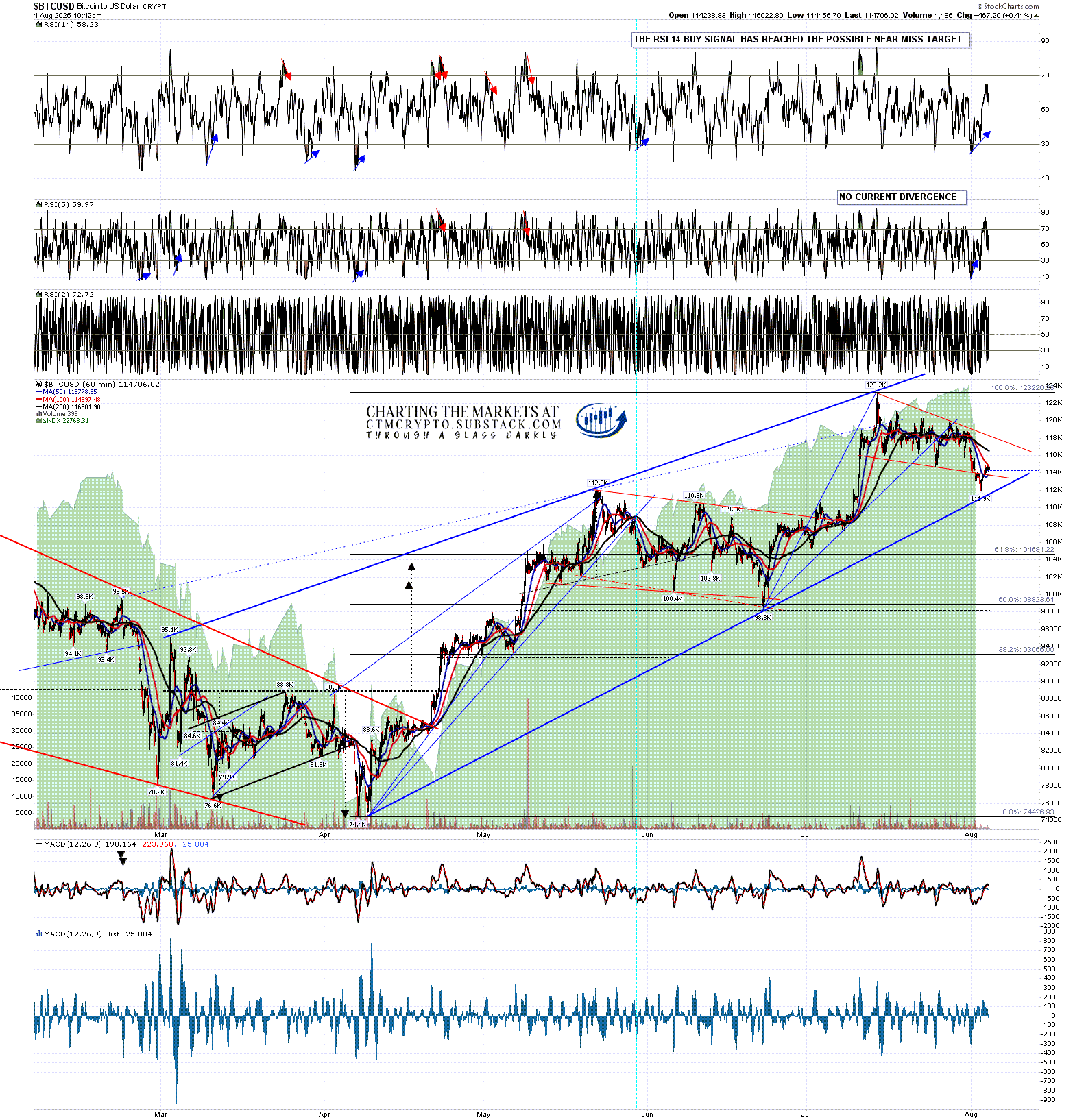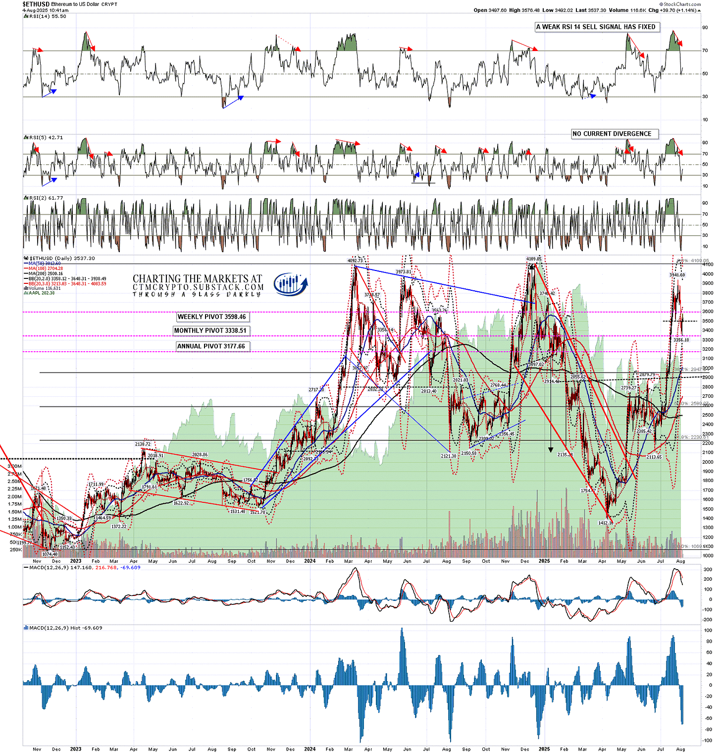 Looking at Bitcoin first the rising wedge I was looking at in my last post has come close to a test of the rising wedge support trendline, currently at 112k. The pattern from the high may well be a bull flag forming but I’m thinking that wedge support may well break and, if so, I’d be watching the 38.2% and 50% retracement levels in the 104.5k and 98.8k areas respectively.