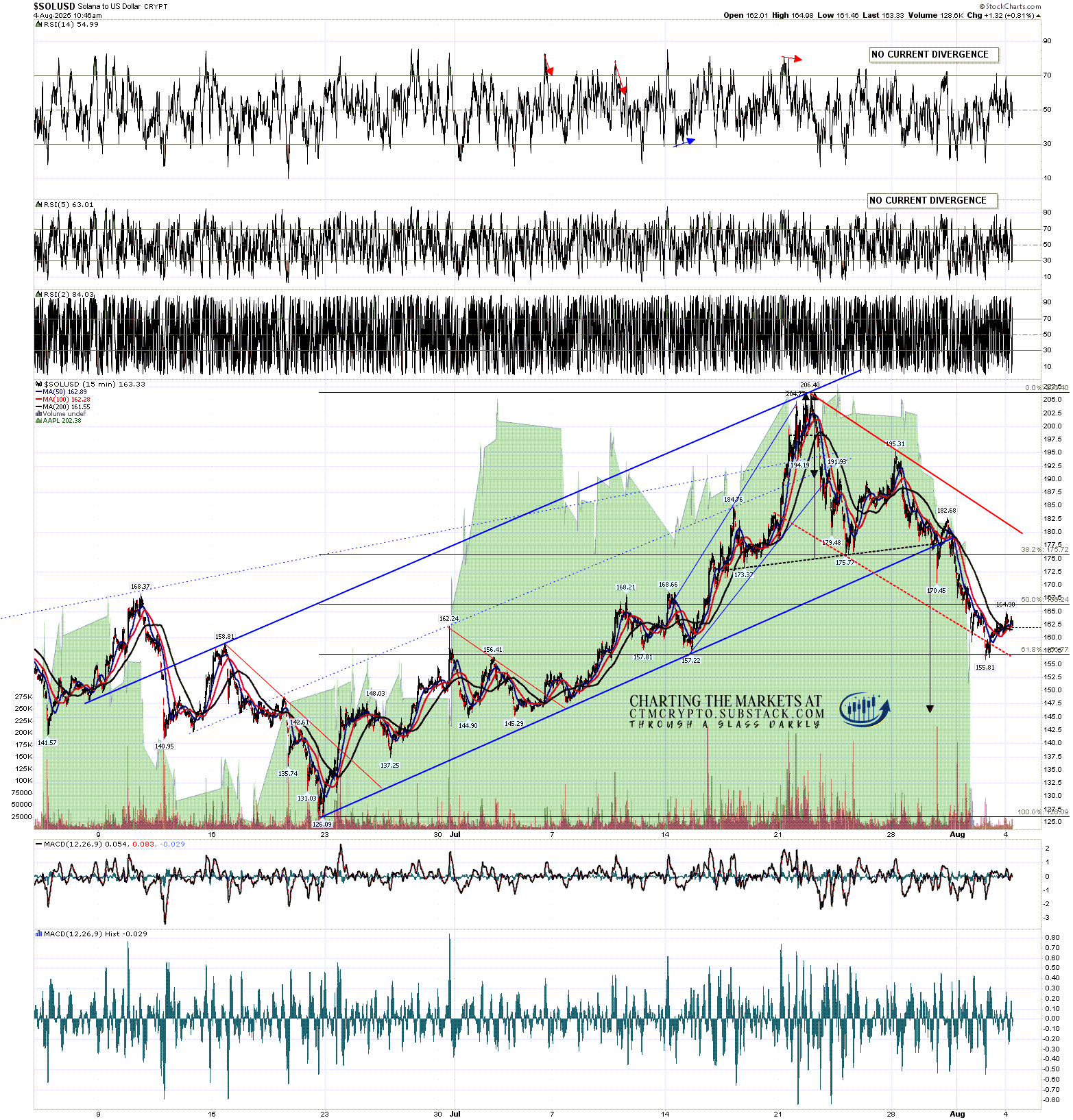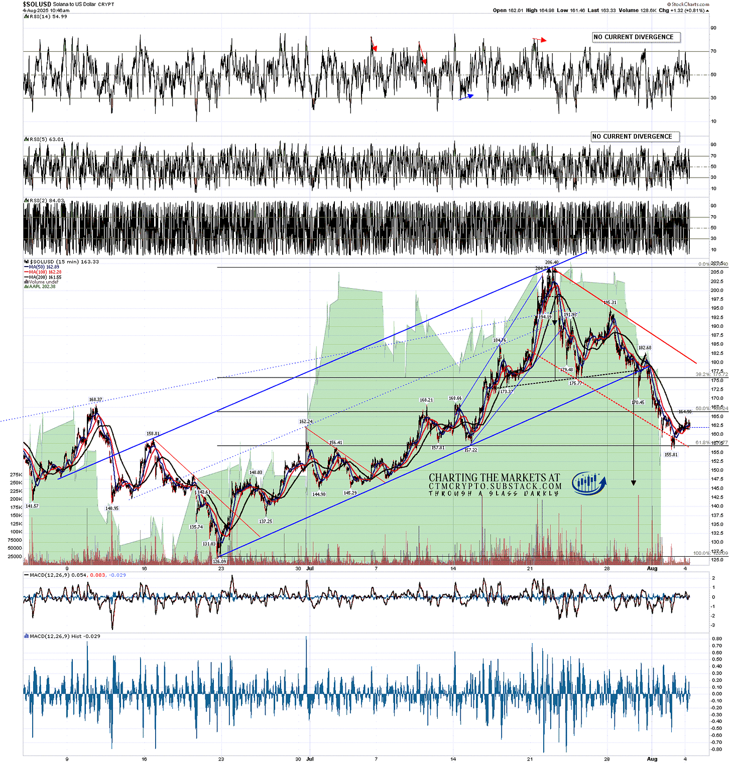 Looking at the 15min chart Solana has broken down from an H&S with a target in the 147 area, currently a strong match with the rising support trendline on the daily chart and, given that I’m also expecting at least another leg down on equity indices in the near future, I like the odds of that H&S reaching target.