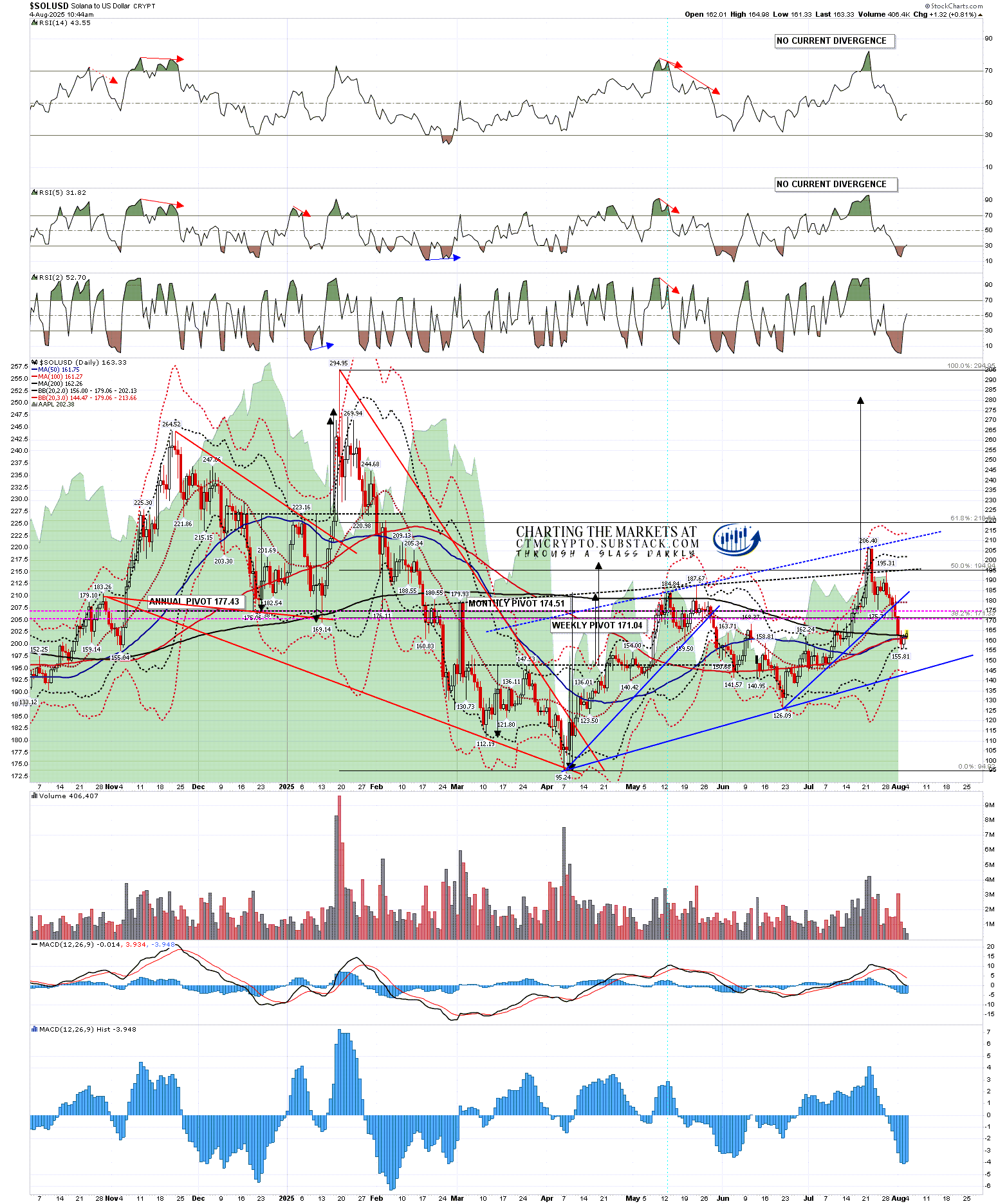 On the Solana daily chart the IHS broke up with a target in the 285 area but I’m still considering the possibility that the IHS may fail. That failure would be on a move that breaks the right shoulder low at 126.09 and would trigger a target at a retest of the April low at 95.24.