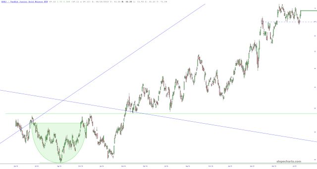 Oddly, the junior miners aren’t as well-formed. Yes, they’re up, but the “regular” miners ETF looks a lot better than GDXJ.