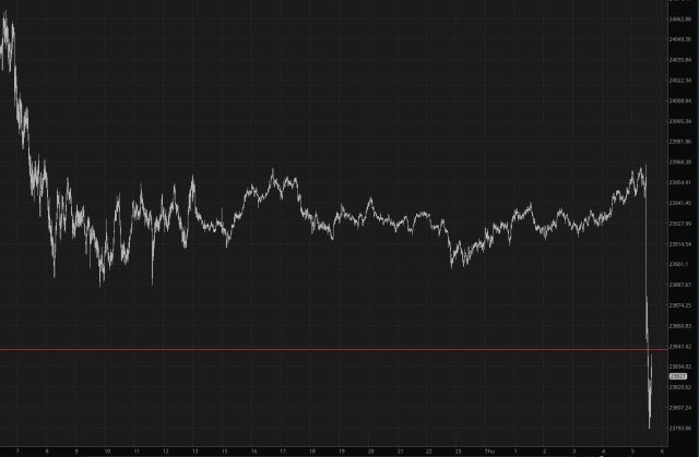 This all looks quite dramatic, but as I’m typing these words, the /NQ is down 0.4% and the /RTY is down about three times that much. The point being that, yeah, it’s down, and that’s great, but giving the shocking nature of this number, this seems a muted reaction.