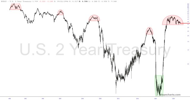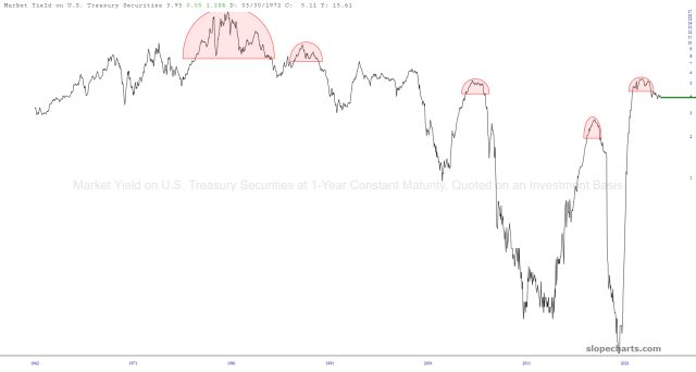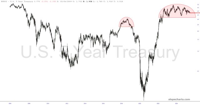 Following Powell’s surrender on Friday, a glance through the charts seems to strongly support the prospect that rates across the board are going to drop substantially. I do not pretend to be an interest rate expert, but it seems to me shorter-term rates will be more prone to weakening than, let’s say, the thirty year. Almost all the charts below have a similar setup: a sharp rise in rates, a rounded top, and what appears to be the beginning of a drop. Here we have the 10-year rates: