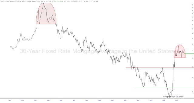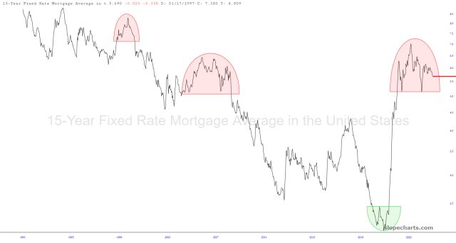 Mortgage rate for 15-year loans (take note how, historically, these tinted zones have been followed by substantial drops):
