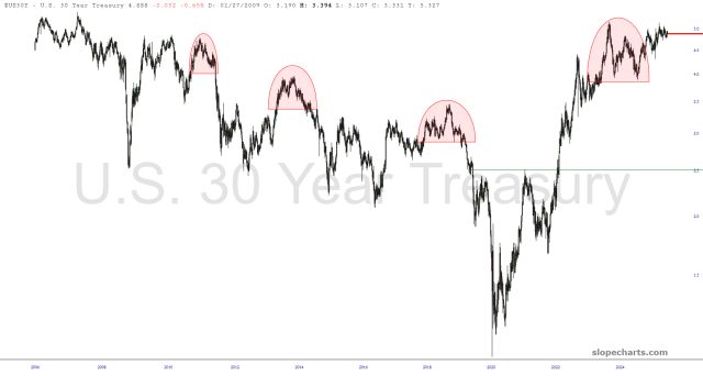 The one freak amidst all of these is the 30 Year Treasury, whose rate HAD been in a topping pattern but in recent months has garnered strength and busted well above it. This is a good illustration as to how tops that are in formation aren’t really legitimated until the price level has dropped below the base of the pattern.