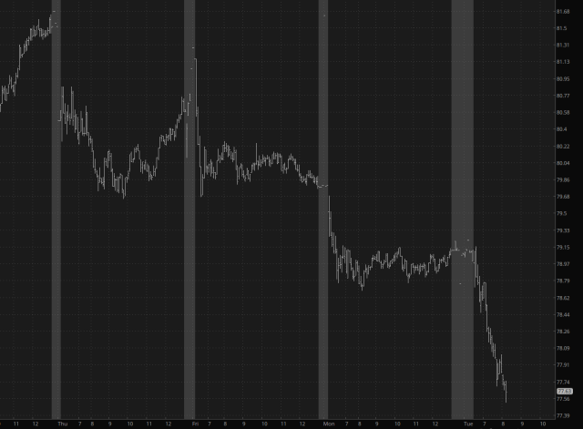 The /NQ above is by far my largest short (by way of QQQ) although it’s good to see the /ES, which had the temerity to be green earlier today, join the red party