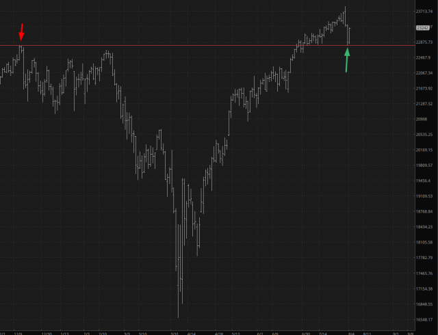 For the /ES, I drew a line months ago anchored to the prior lifetime high (red arrow). On Friday, at the worst part of the drawdown, the /ES nailed this line almost to the penny and reversed higher (green arrow). It has pretty much undone Friday’s drop already.