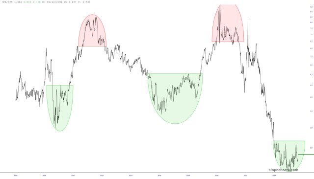 Long-term palladium divided by the SPY. Simple as that: bullish palladium; bearish equities. Thy will be done.