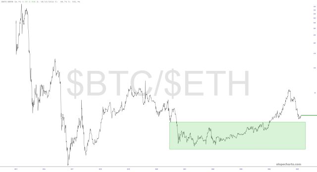 This is a gentle-natured “told ya!” Until recently, Ethereum ($ETH) was exploding higher. About a week ago, I suggested this relative outperformance was nearing its end, judging from this ratio chart, which was “bearish”, so to speak.
