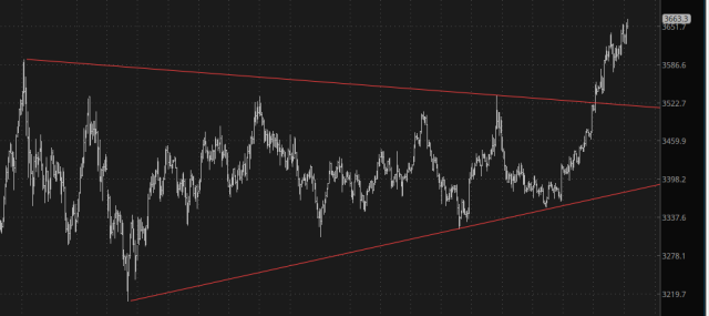 The overall theme of “bullish precious/bearish equities” continues to play out, at least on the numerator side of the equation, as gold continues to utterly outpace stocks, having completed this beautiful symmetric triangle formation.