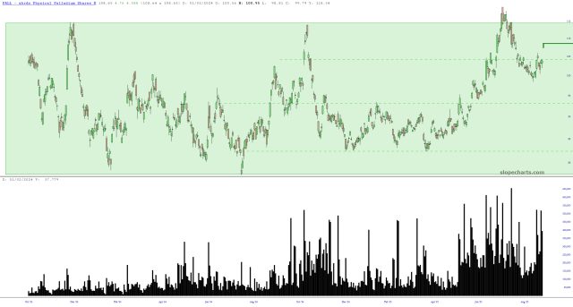 As icing on the cake, interest in palladium, seen by way of the ETF symbol PALL and its volume sub-chart, is quite plainly on the rise.